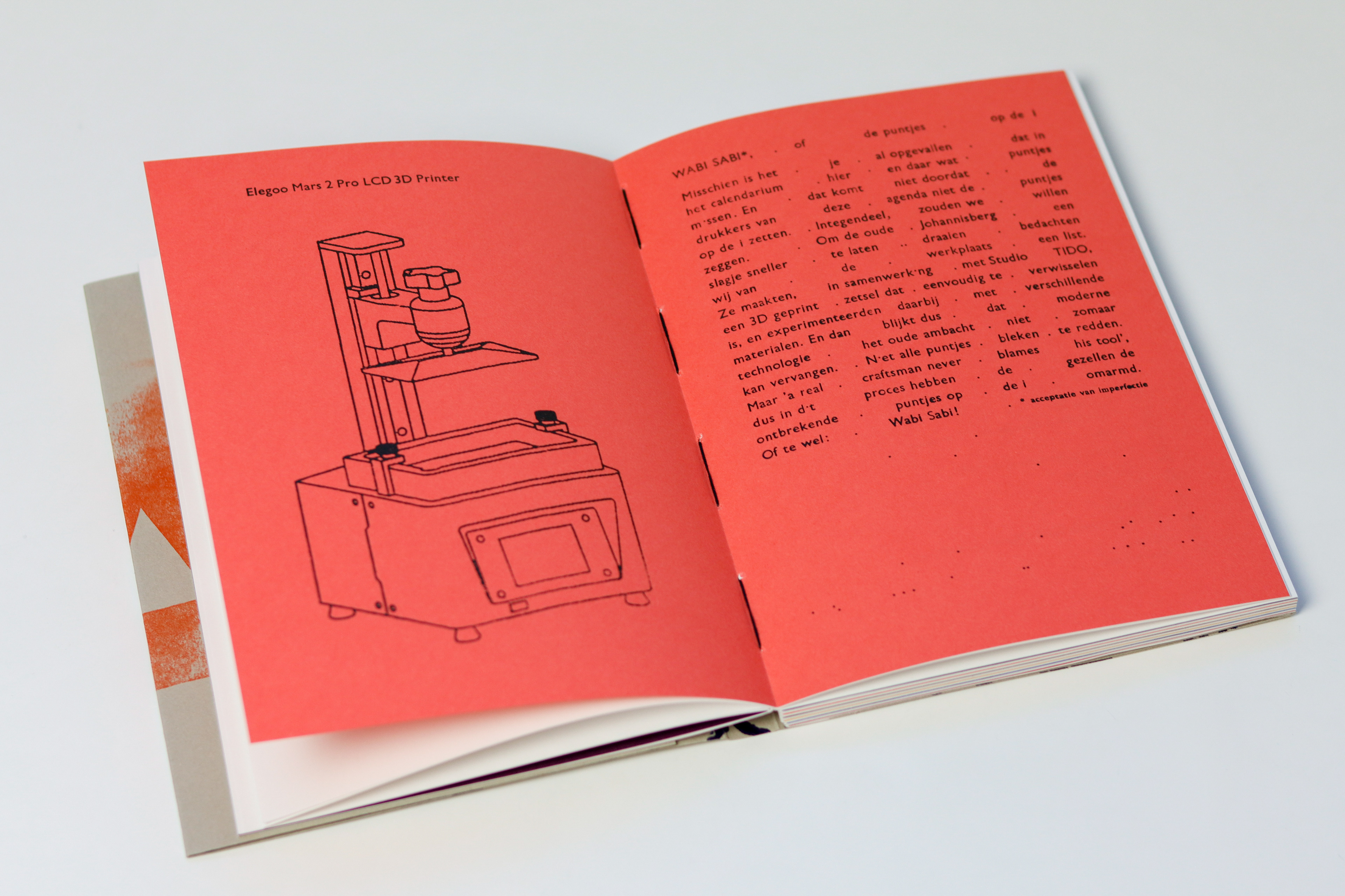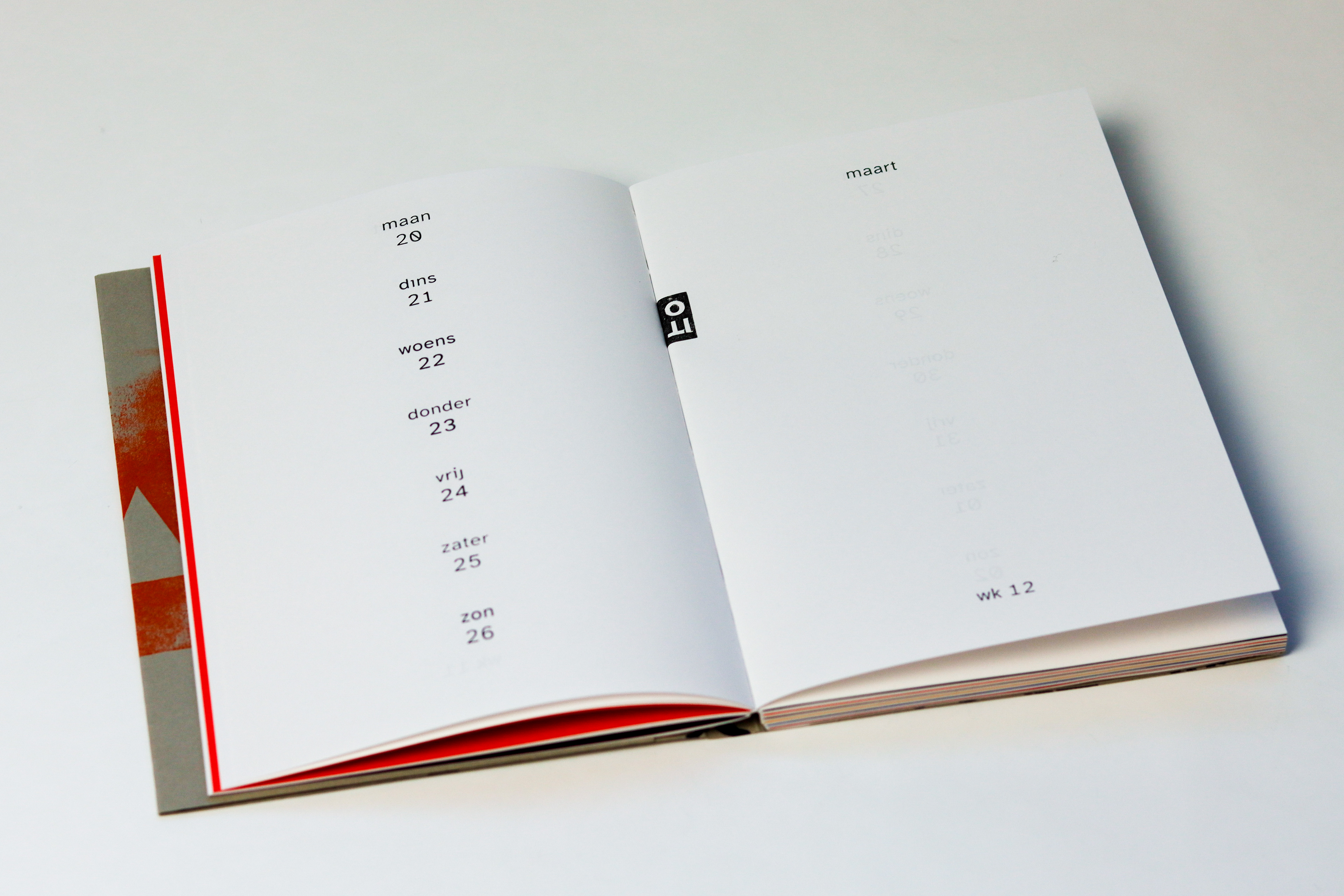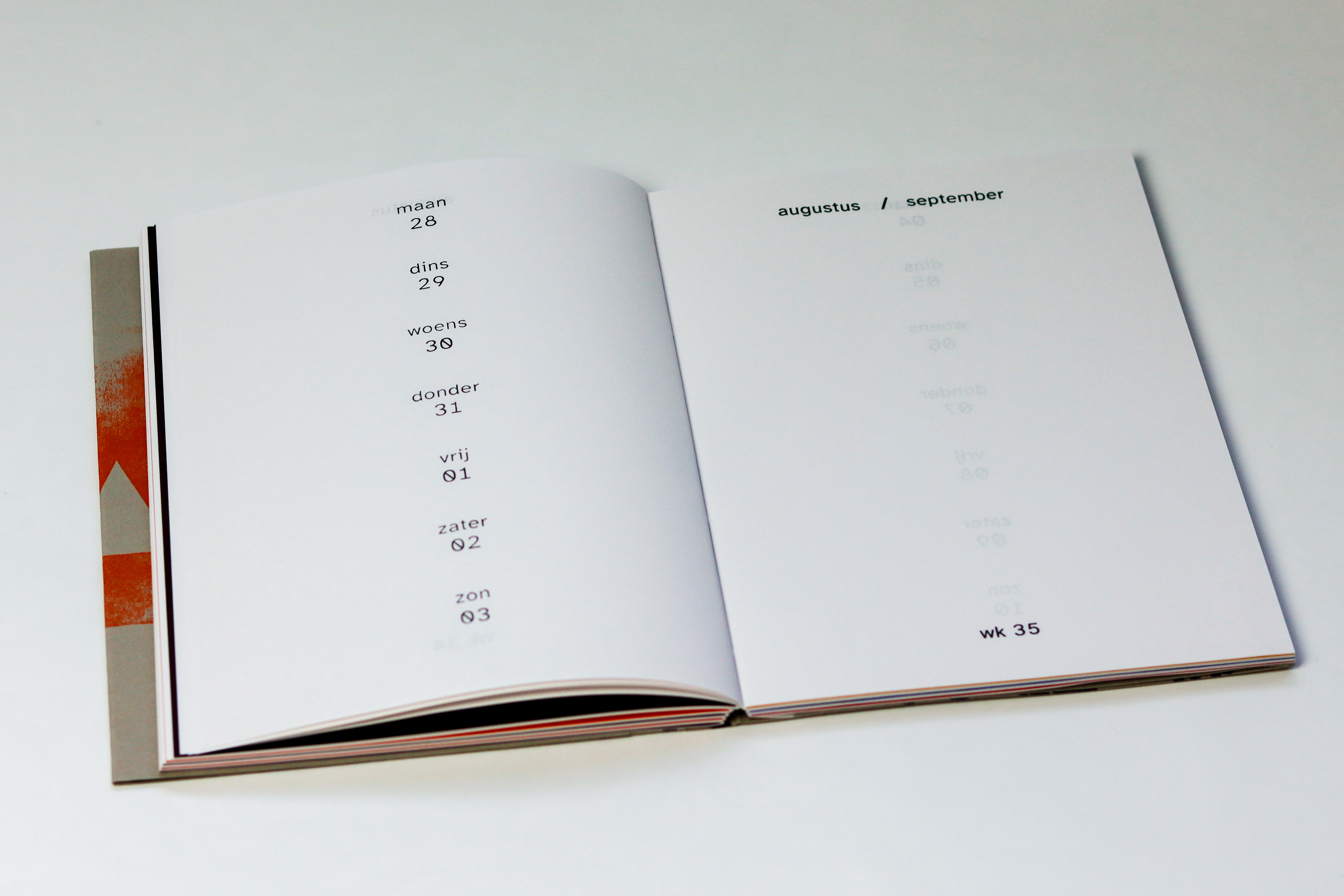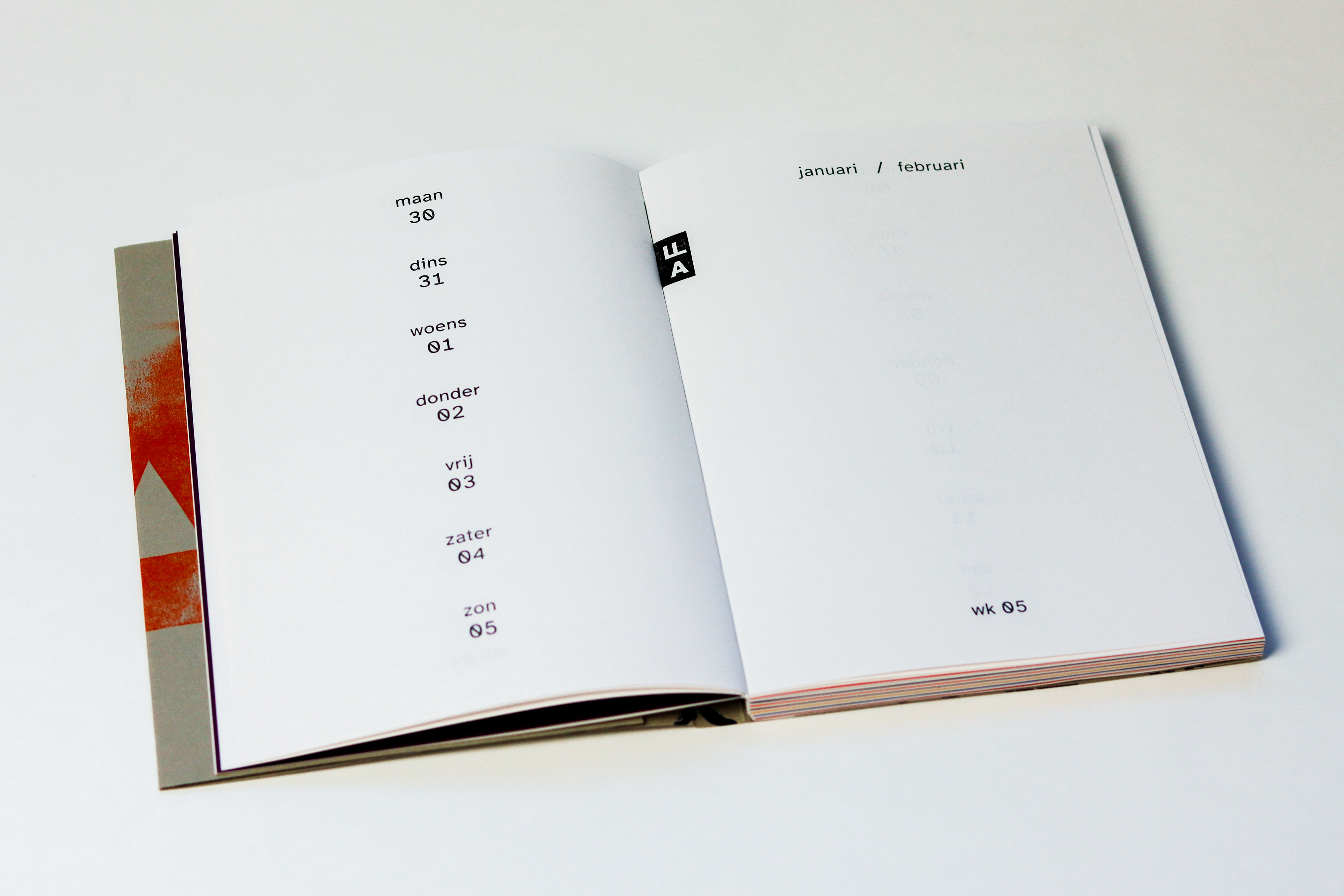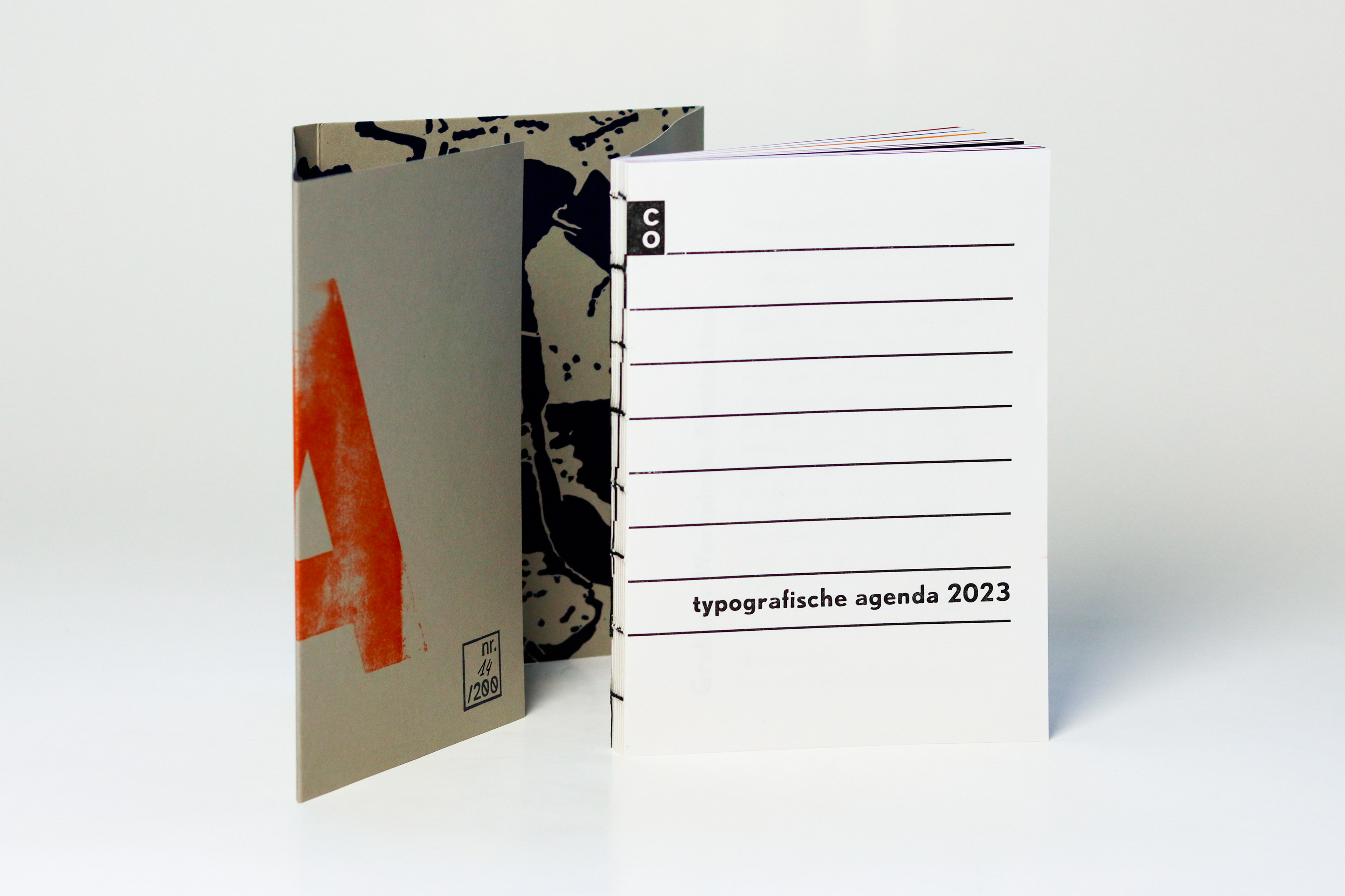 For this agenda we combined the old techniques with the very latest: the letters and shapes were not only made of lead and wood, but also of resin, plywood and many other materials. It was printed page by page on the 1910 Johannisberg Stop cylinder press, in a limited edition. The agenda is hand-bound.