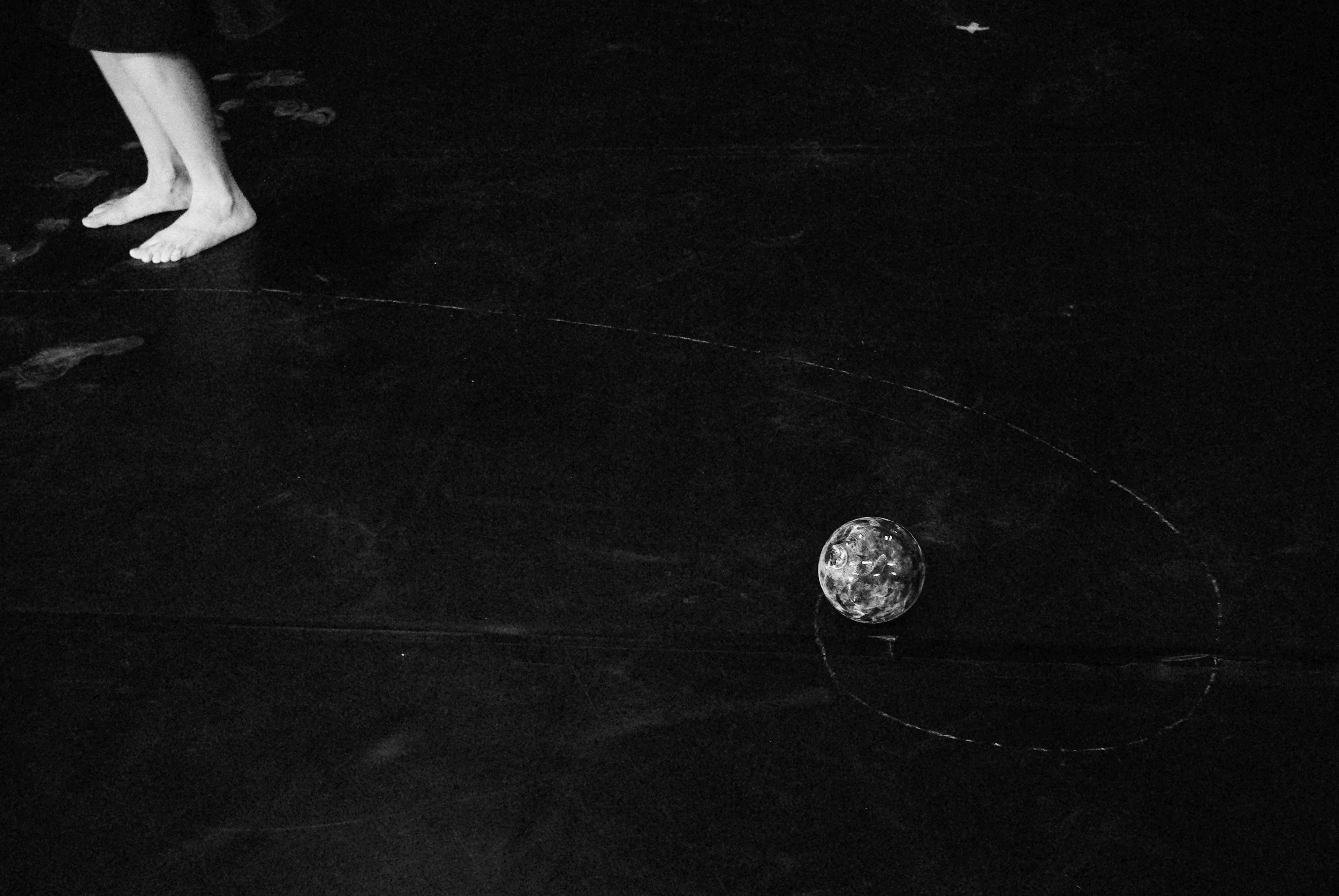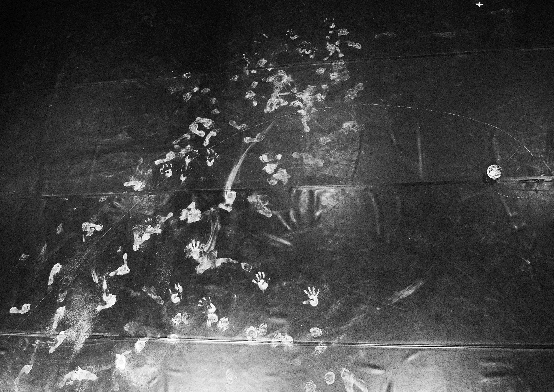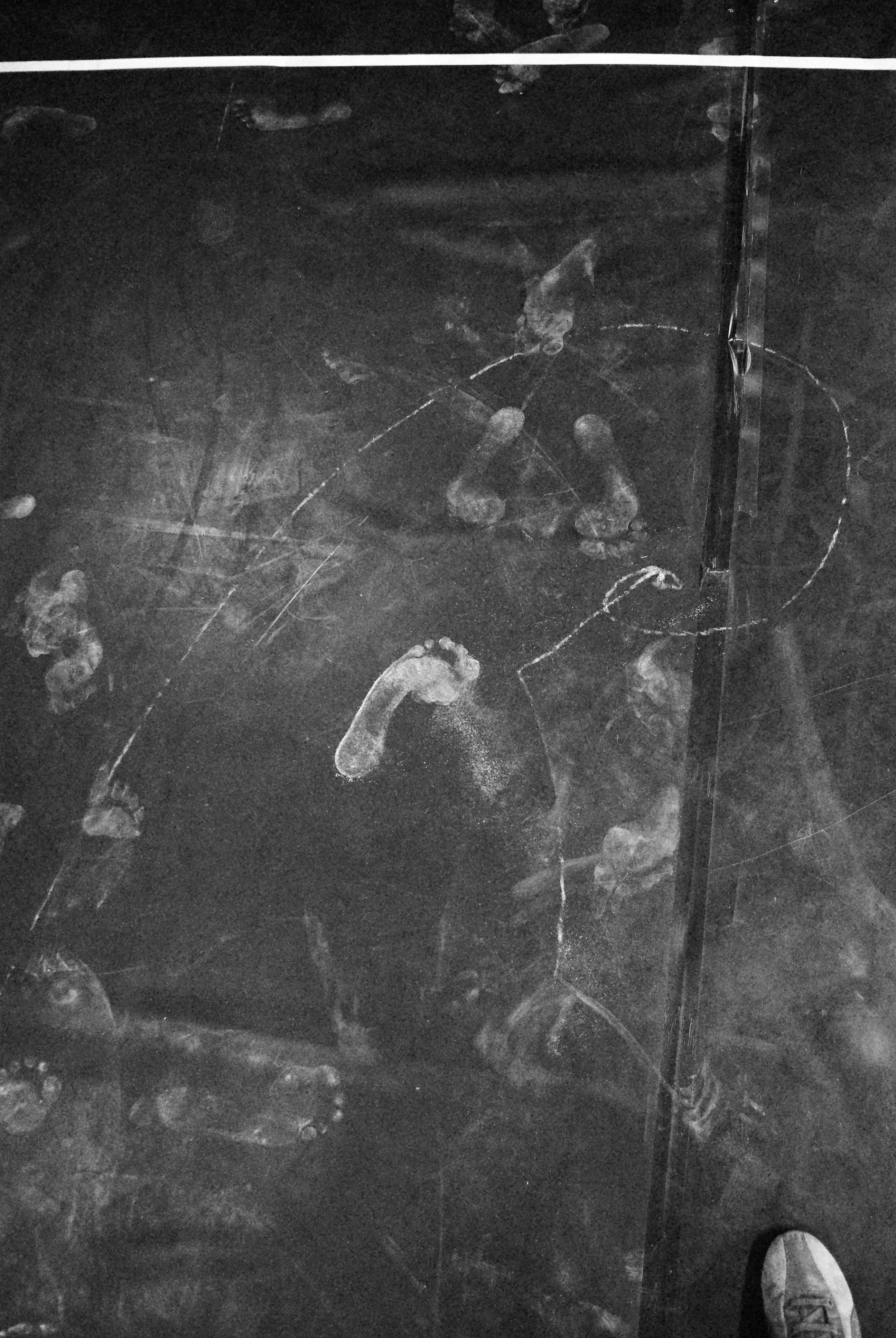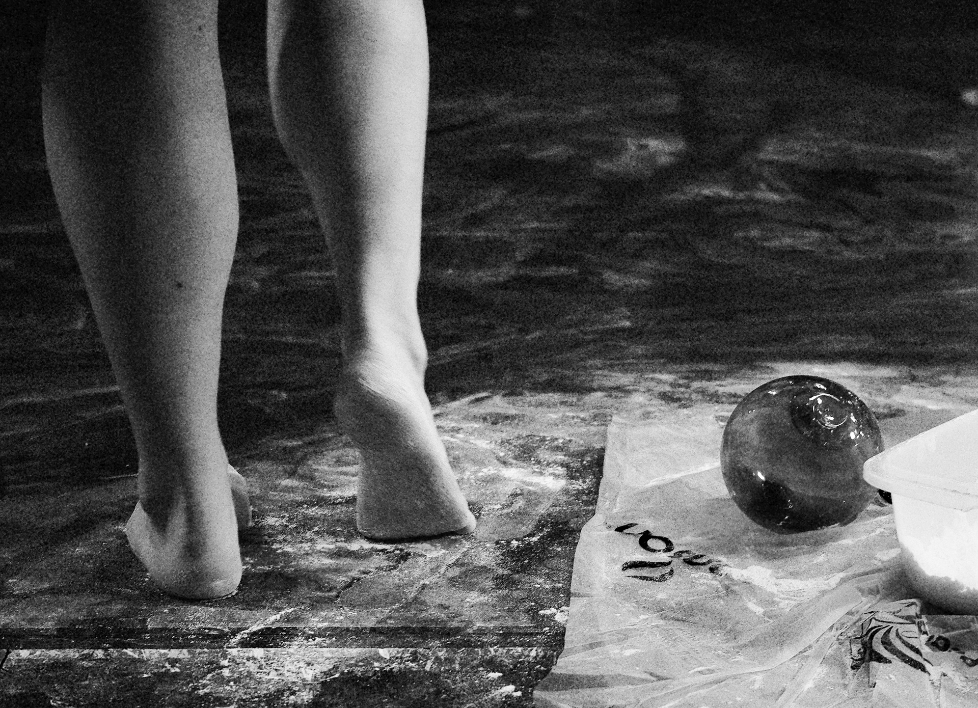 The research on pathways during improvisation dance. Three dancers follow a glass ball and leave prints of feet and hands on the black dance floor. Which part of the space do we take most? Are there certain patterns to be found? Which association evokes the imprint of a foot or a hand?