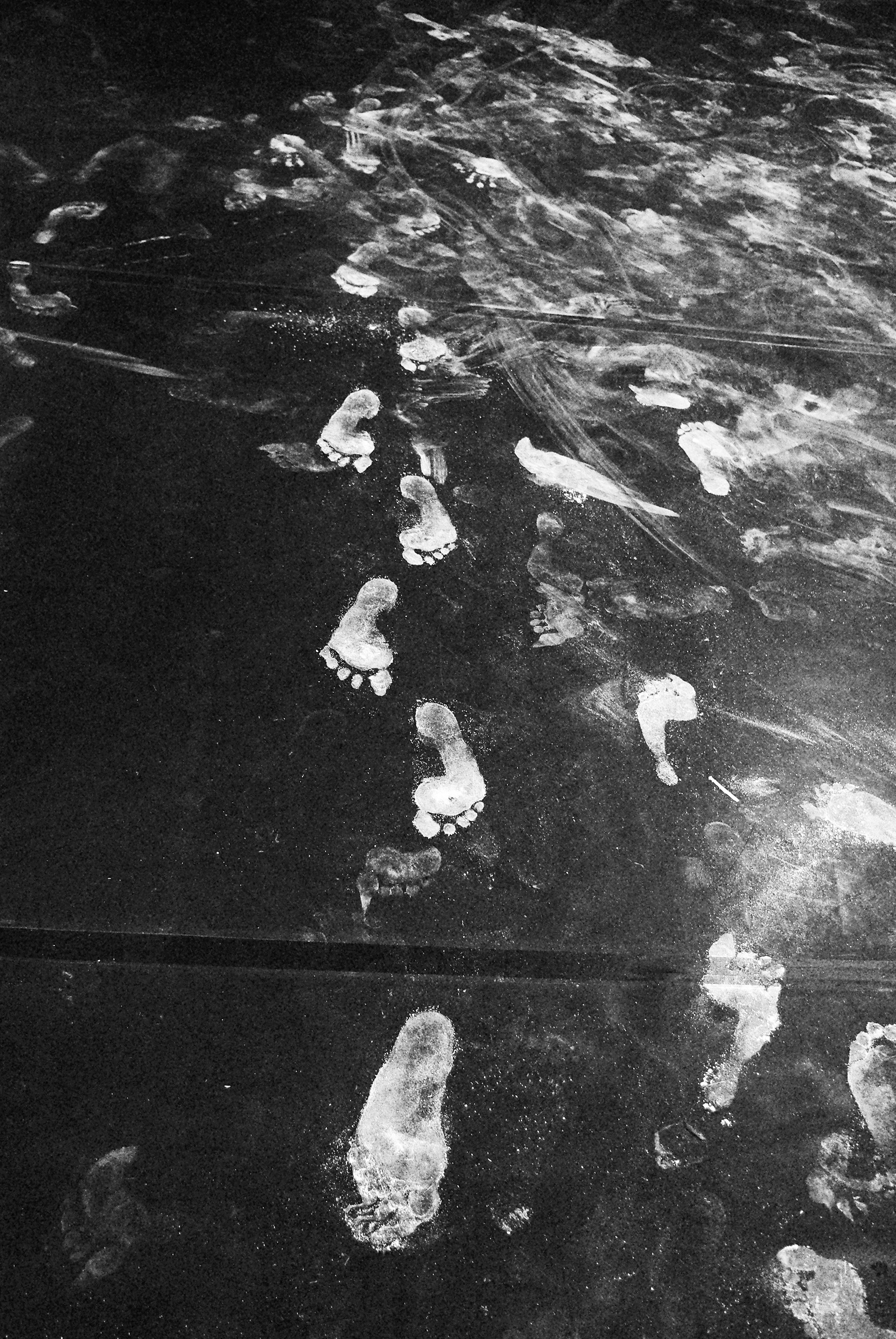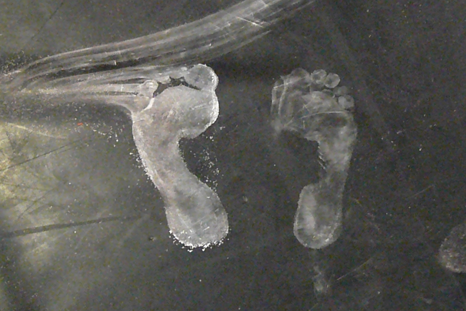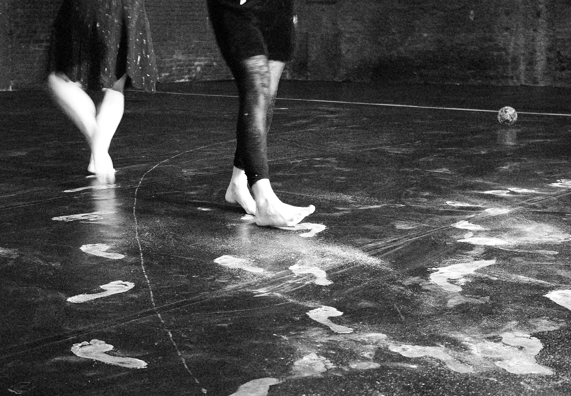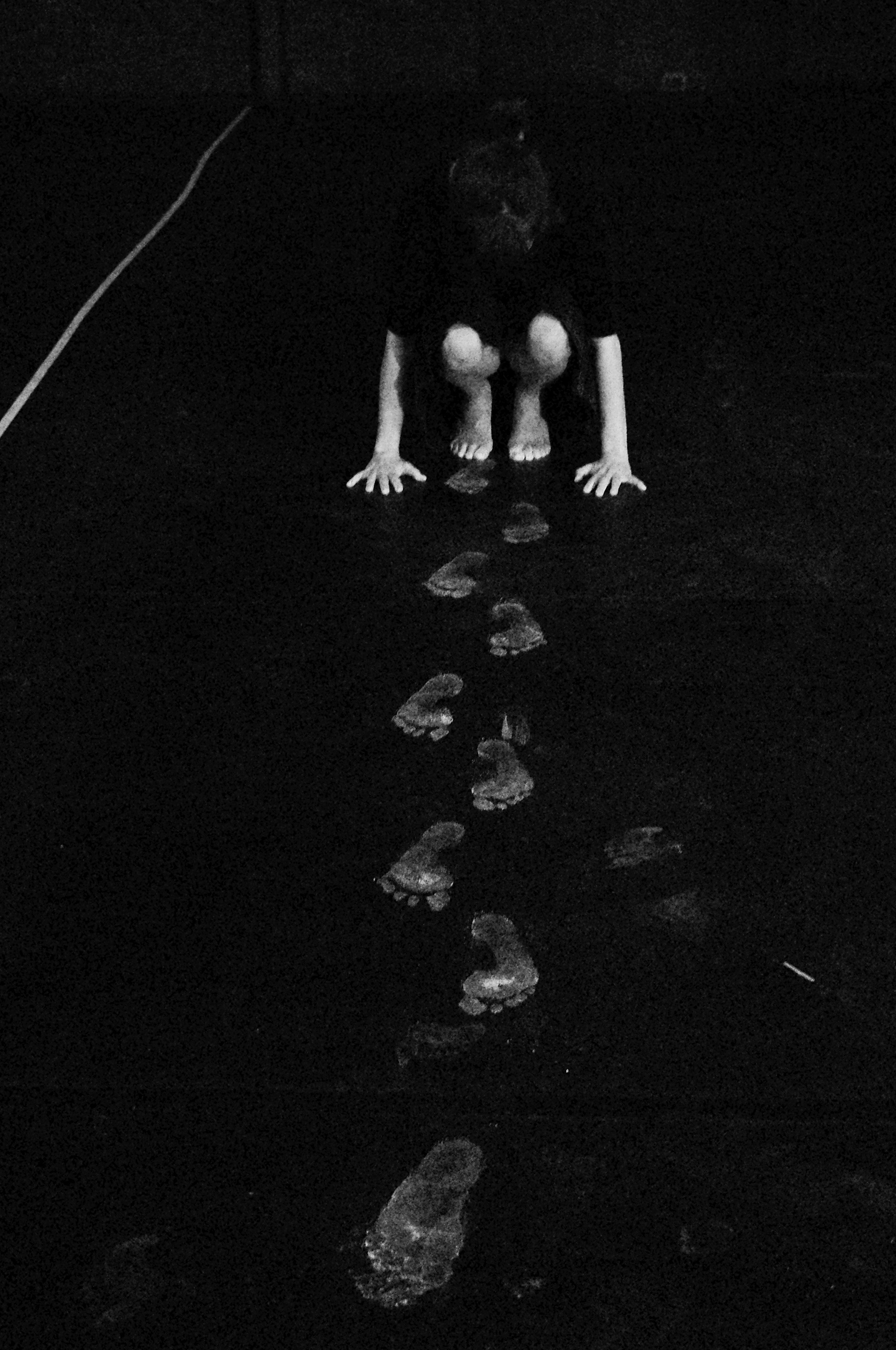 The research on pathways during improvisation dance. Three dancers follow a glass ball and leave prints of feet and hands on the black dance floor. Which part of the space do we take most? Are there certain patterns to be found? Which association evokes the imprint of a foot or a hand?