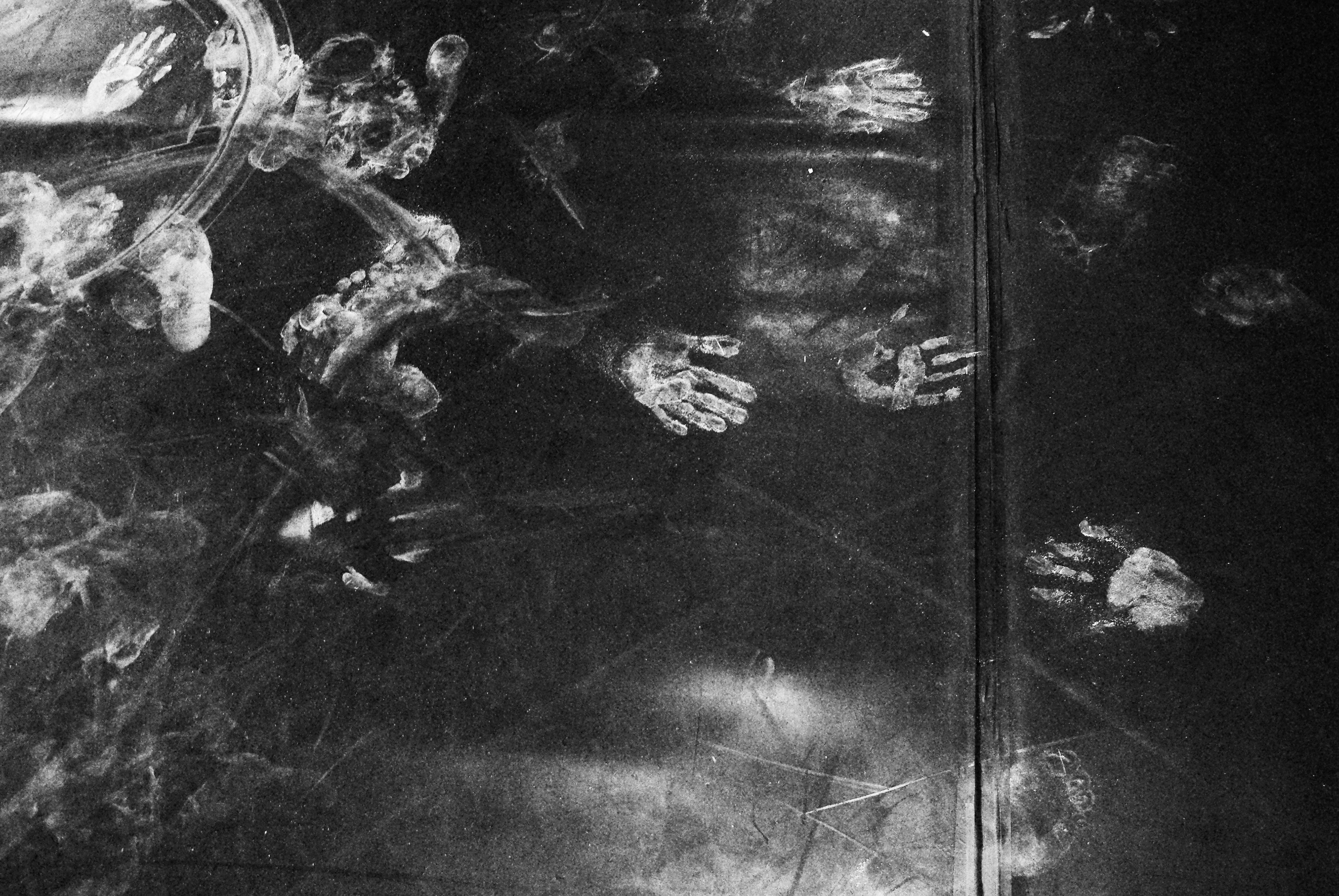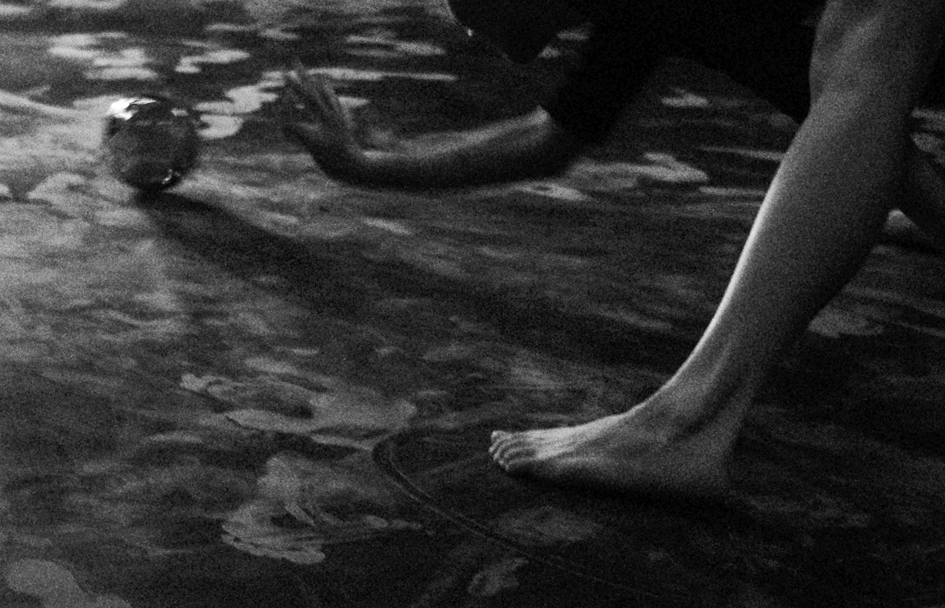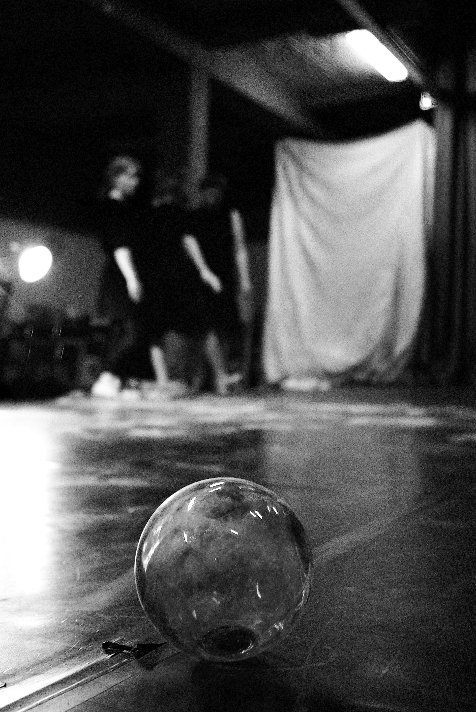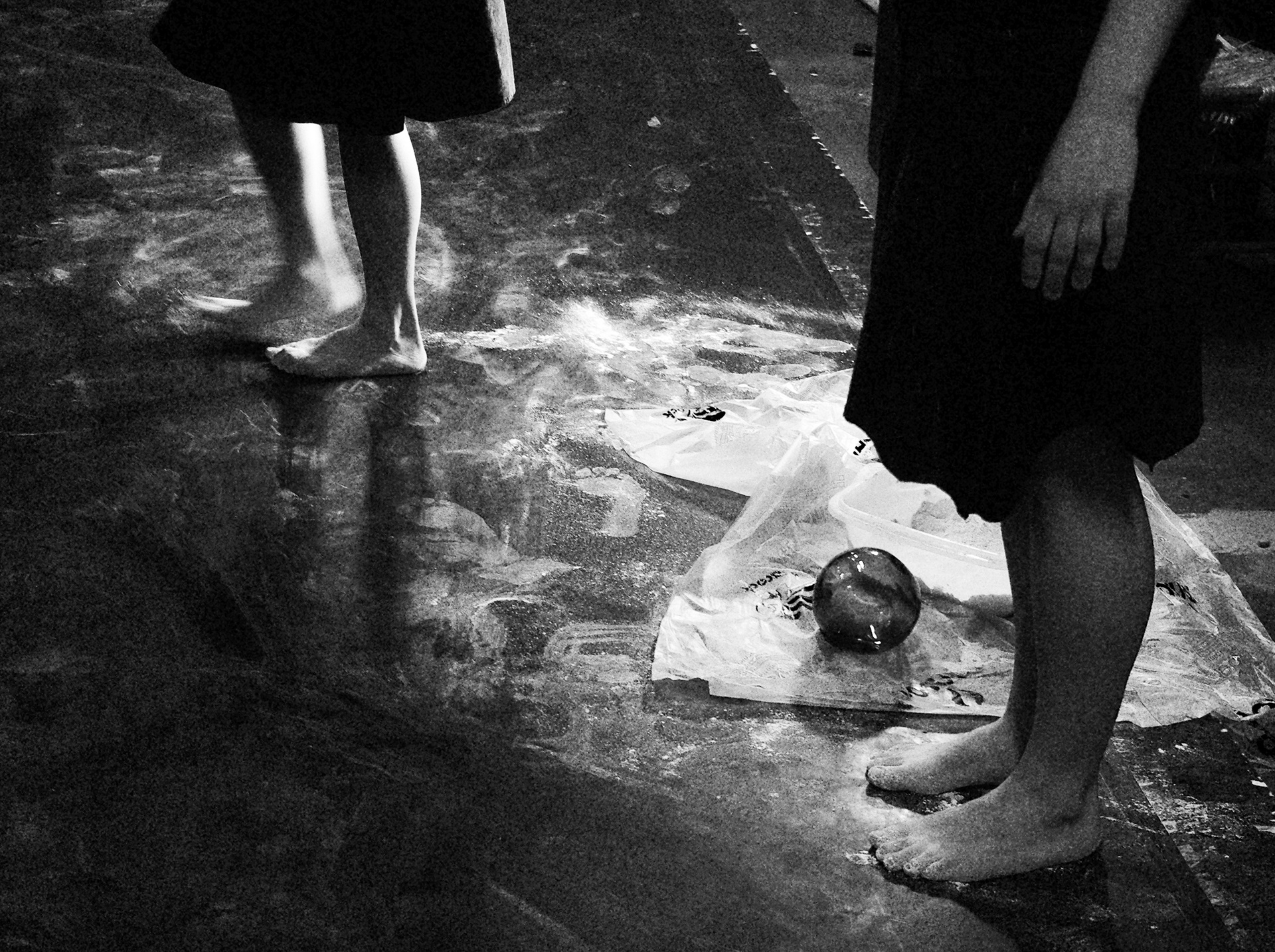 The research on pathways during improvisation dance. Three dancers follow a glass ball and leave prints of feet and hands on the black dance floor. Which part of the space do we take most? Are there certain patterns to be found? Which association evokes the imprint of a foot or a hand?