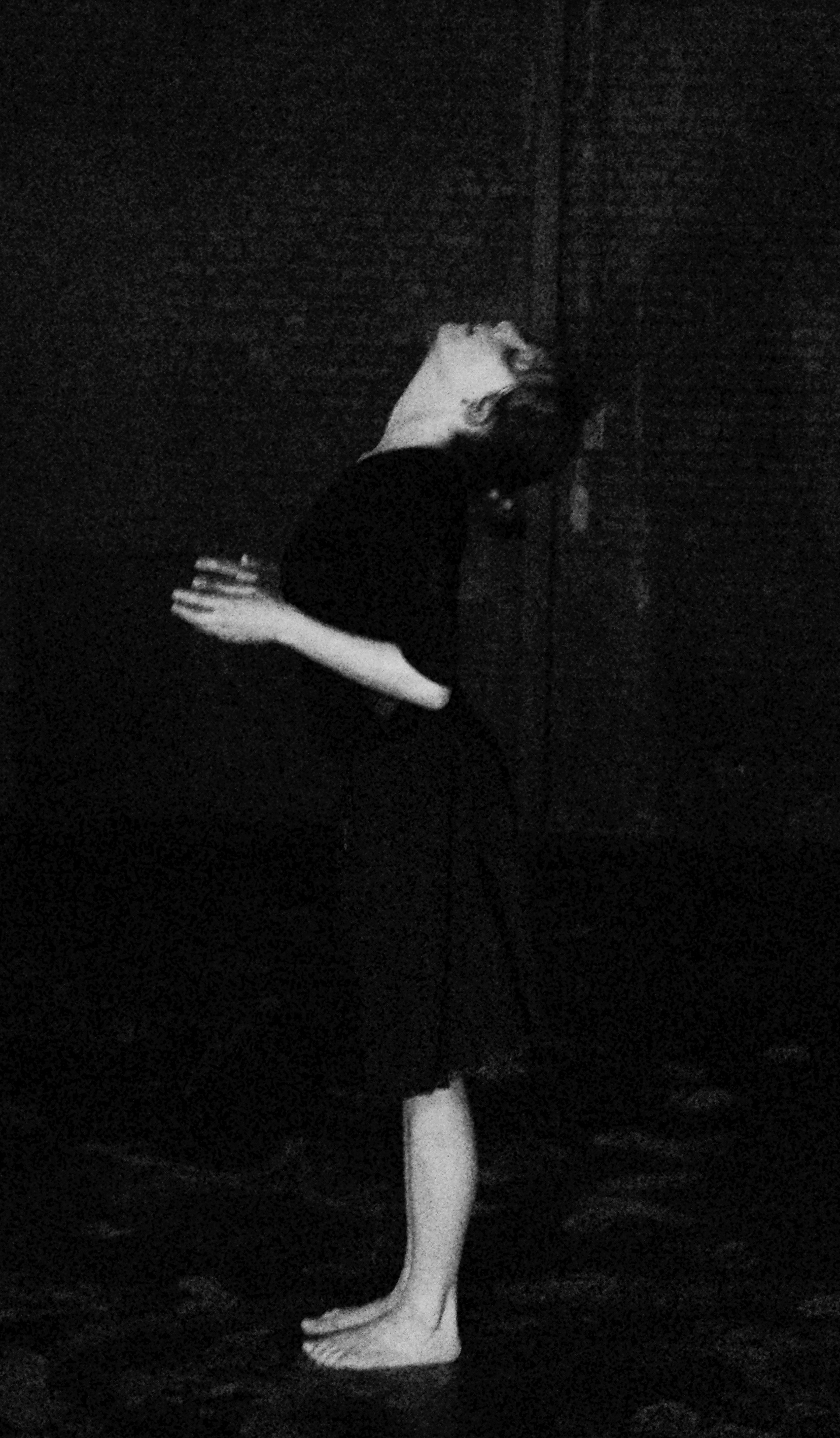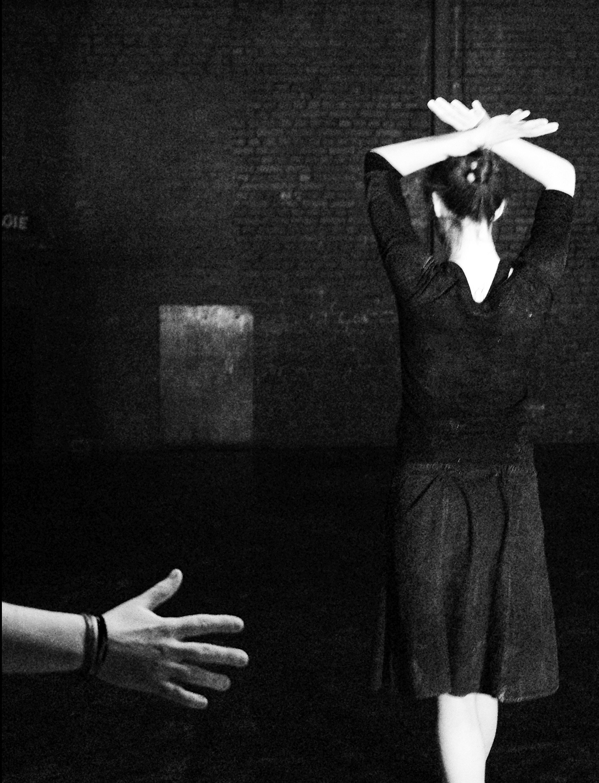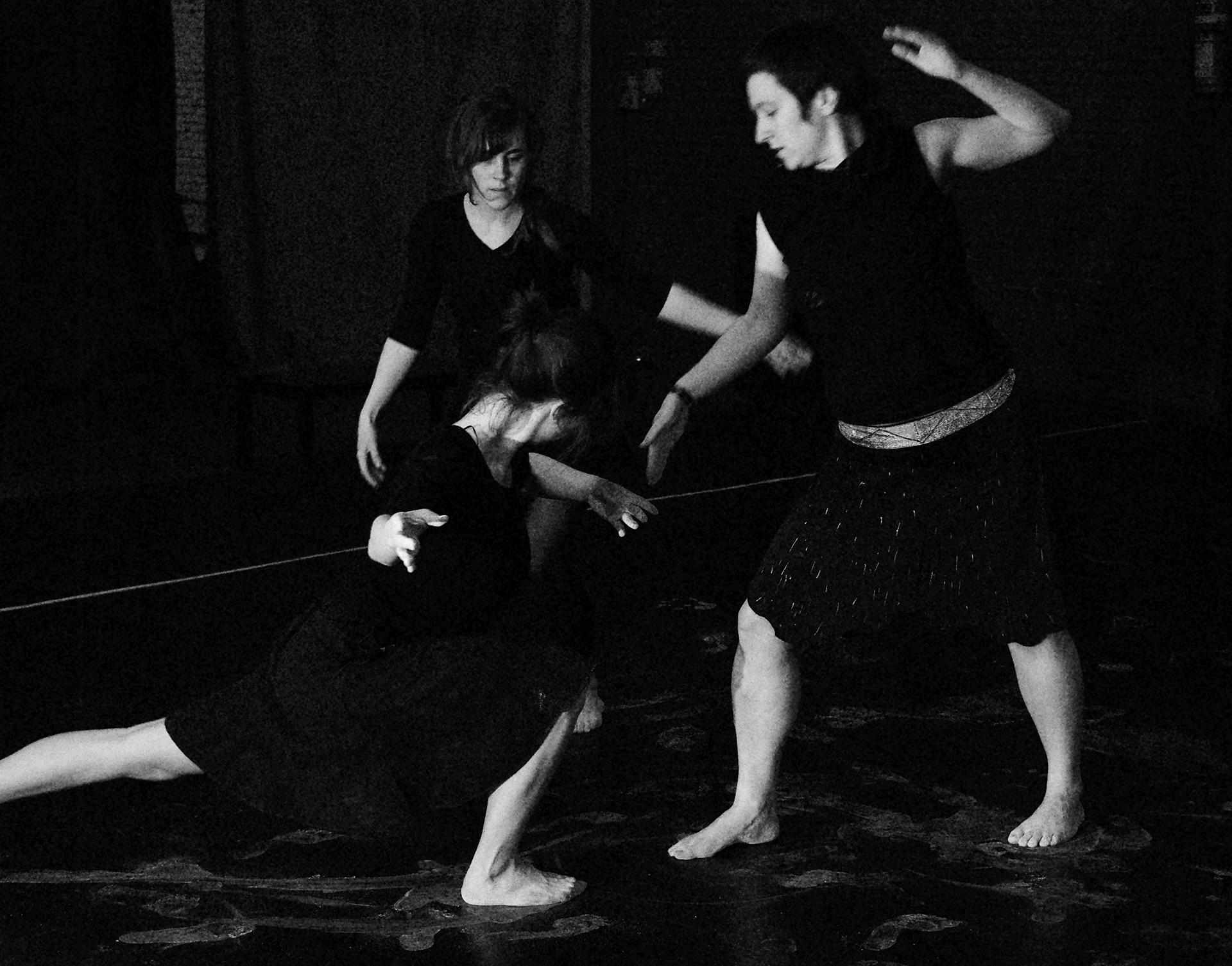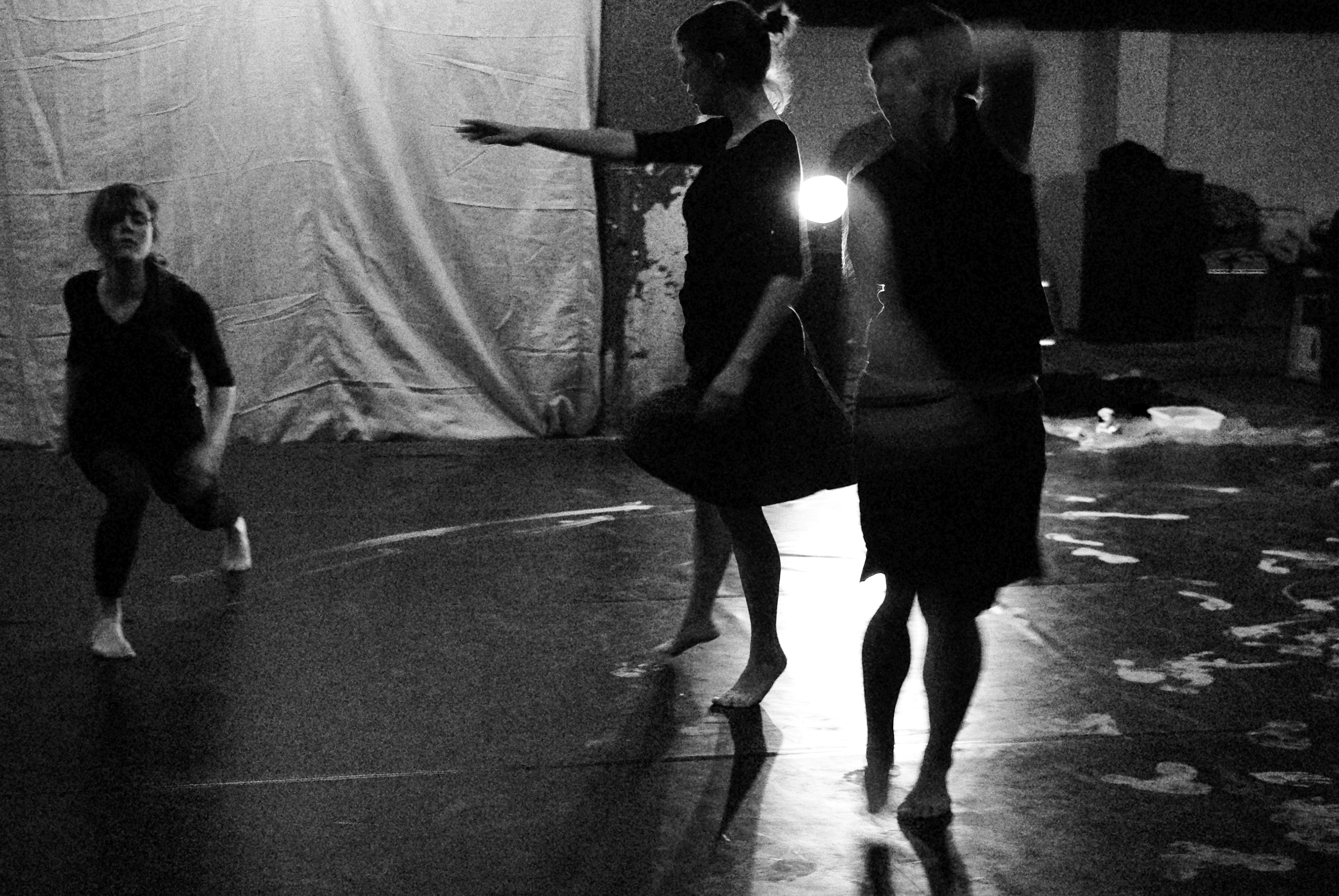 The research on pathways during improvisation dance. Three dancers follow a glass ball and leave prints of feet and hands on the black dance floor. Which part of the space do we take most? Are there certain patterns to be found? Which association evokes the imprint of a foot or a hand?