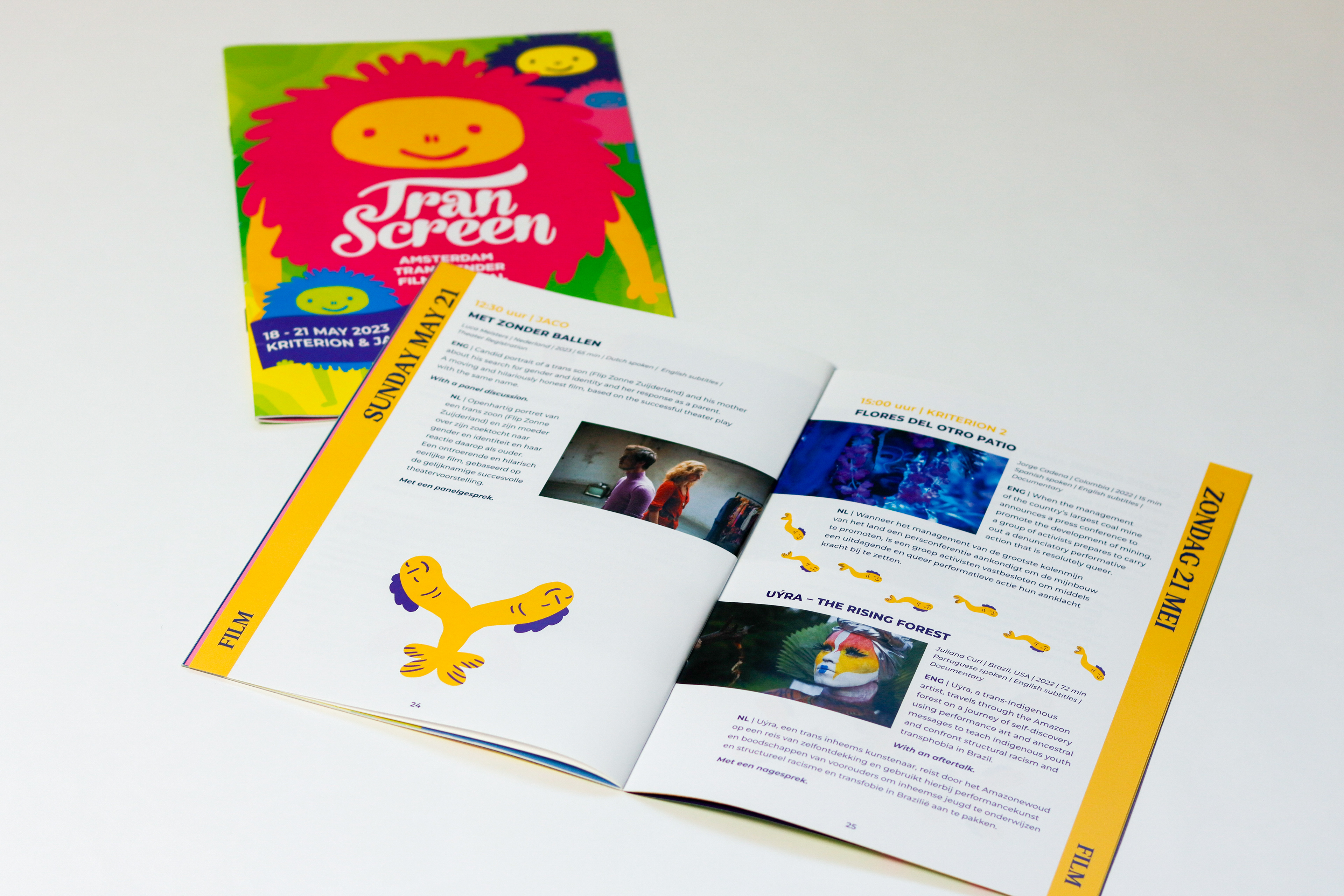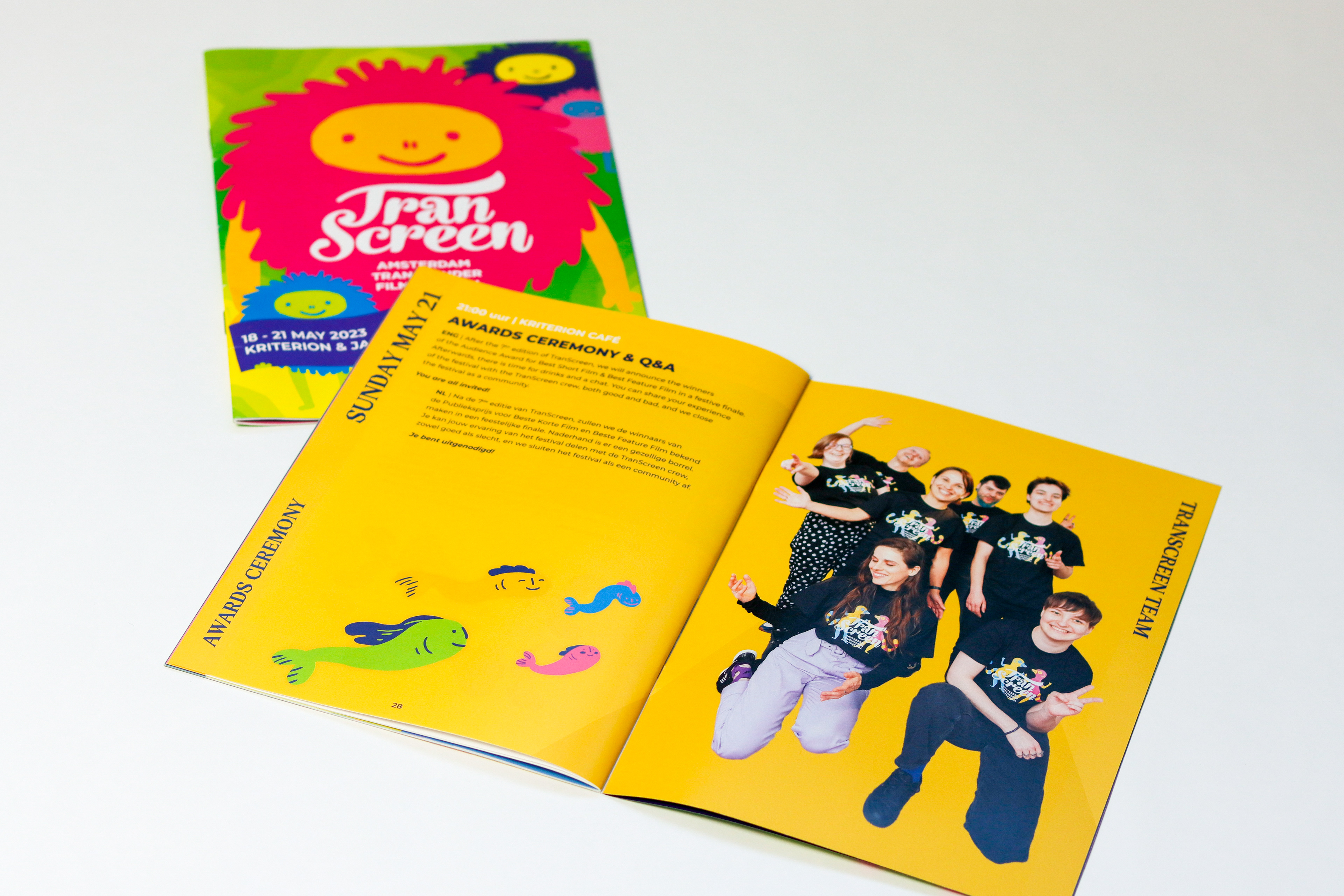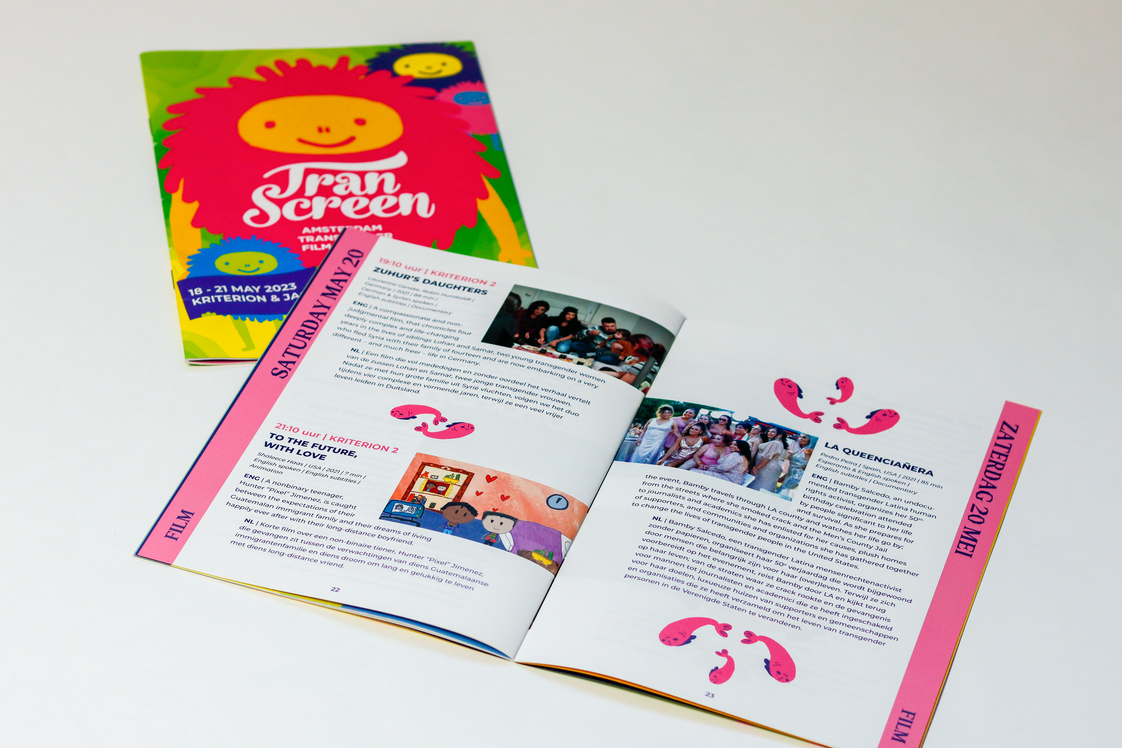 For the 2023 Transcreen Transgender Film Festival, I created a program booklet that, with its colorful and playful design, enhanced the visual presence of the entire campaign in the city.