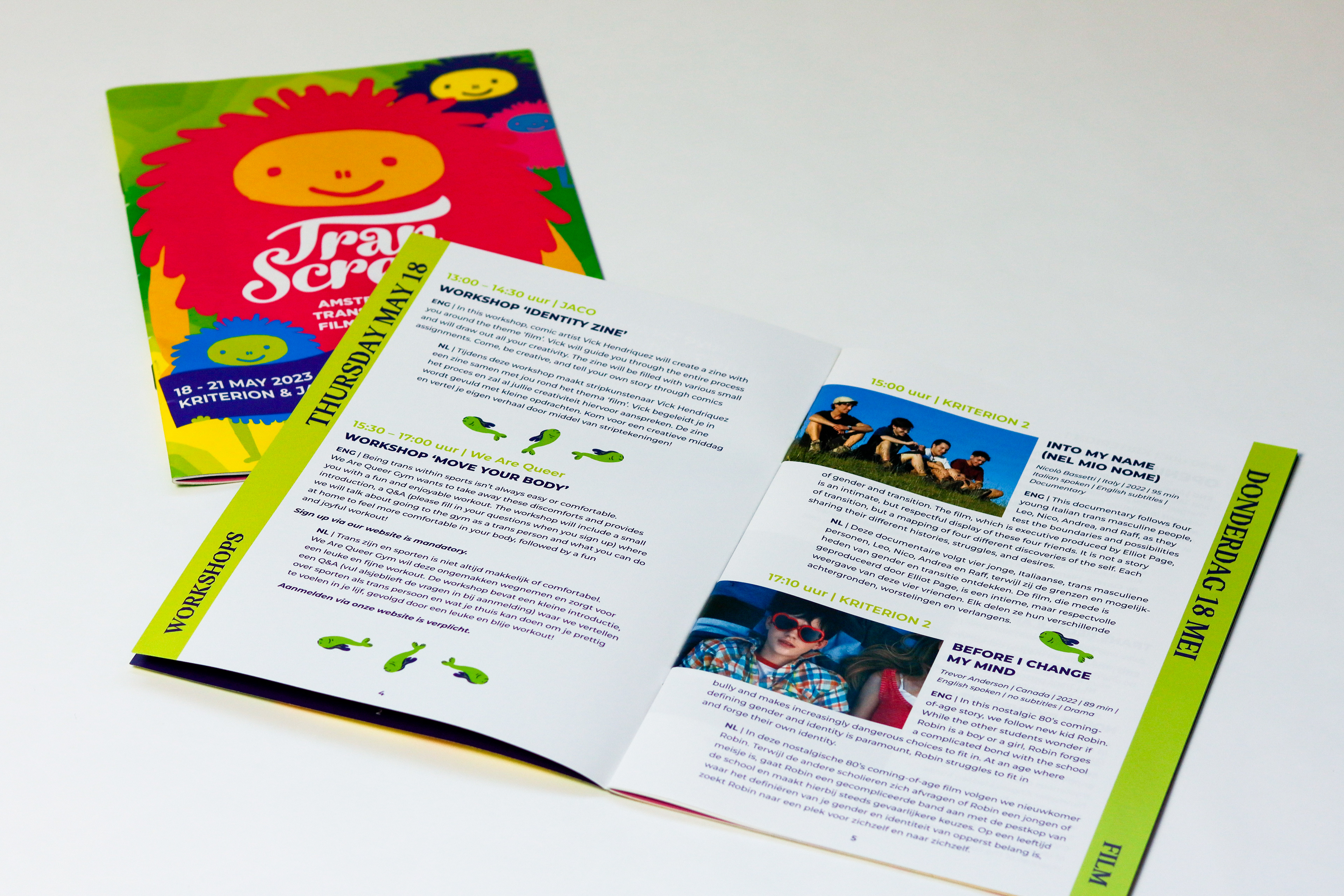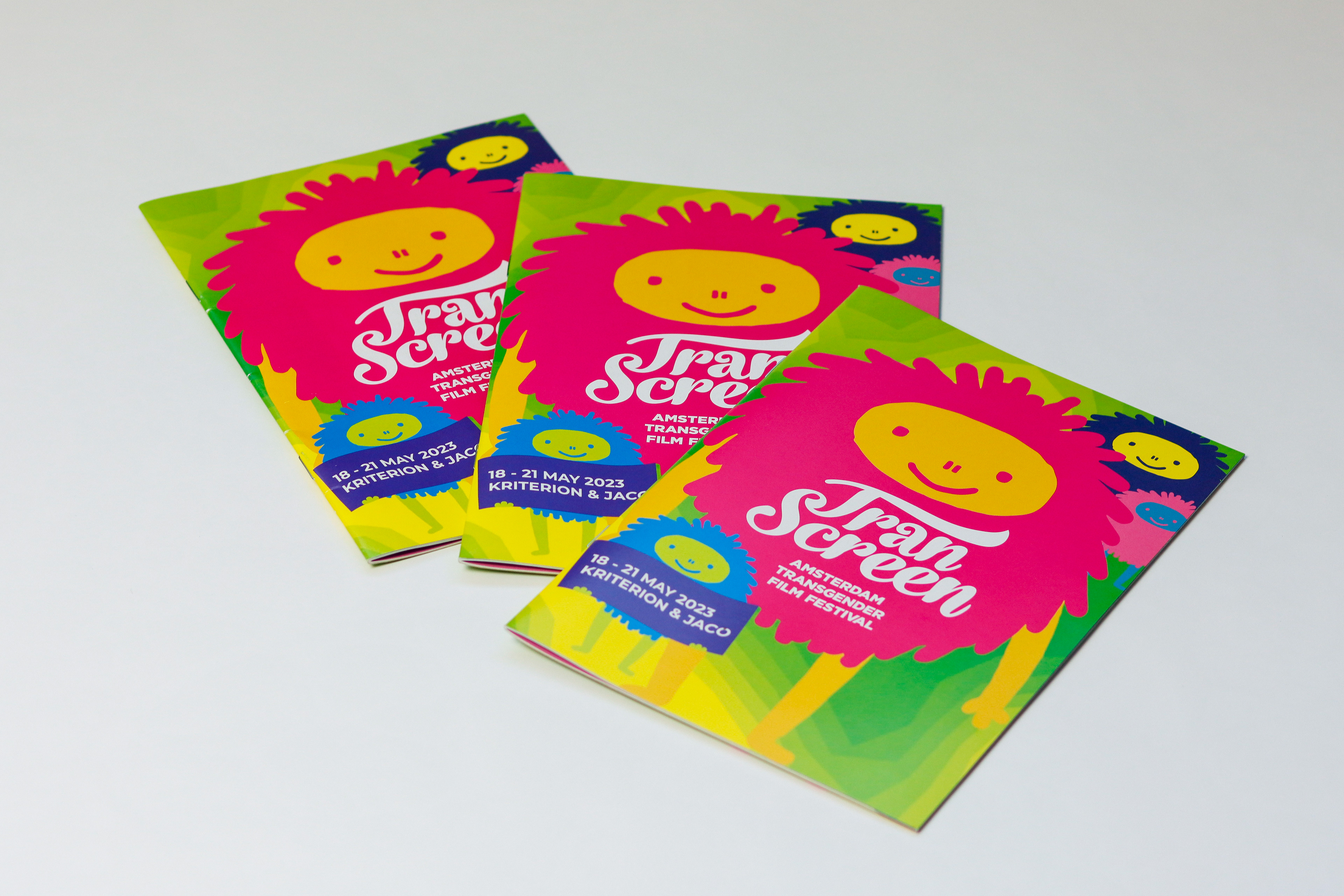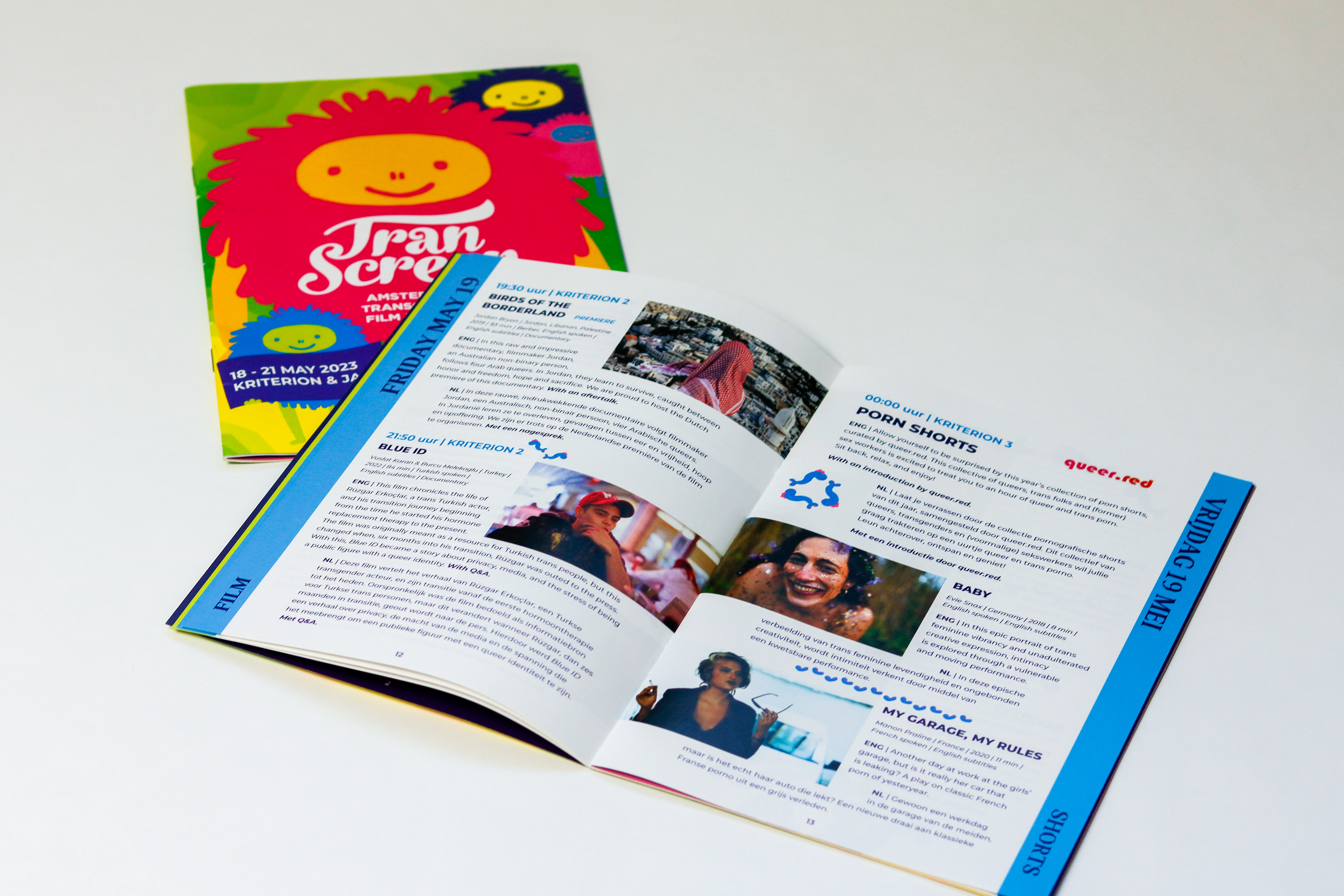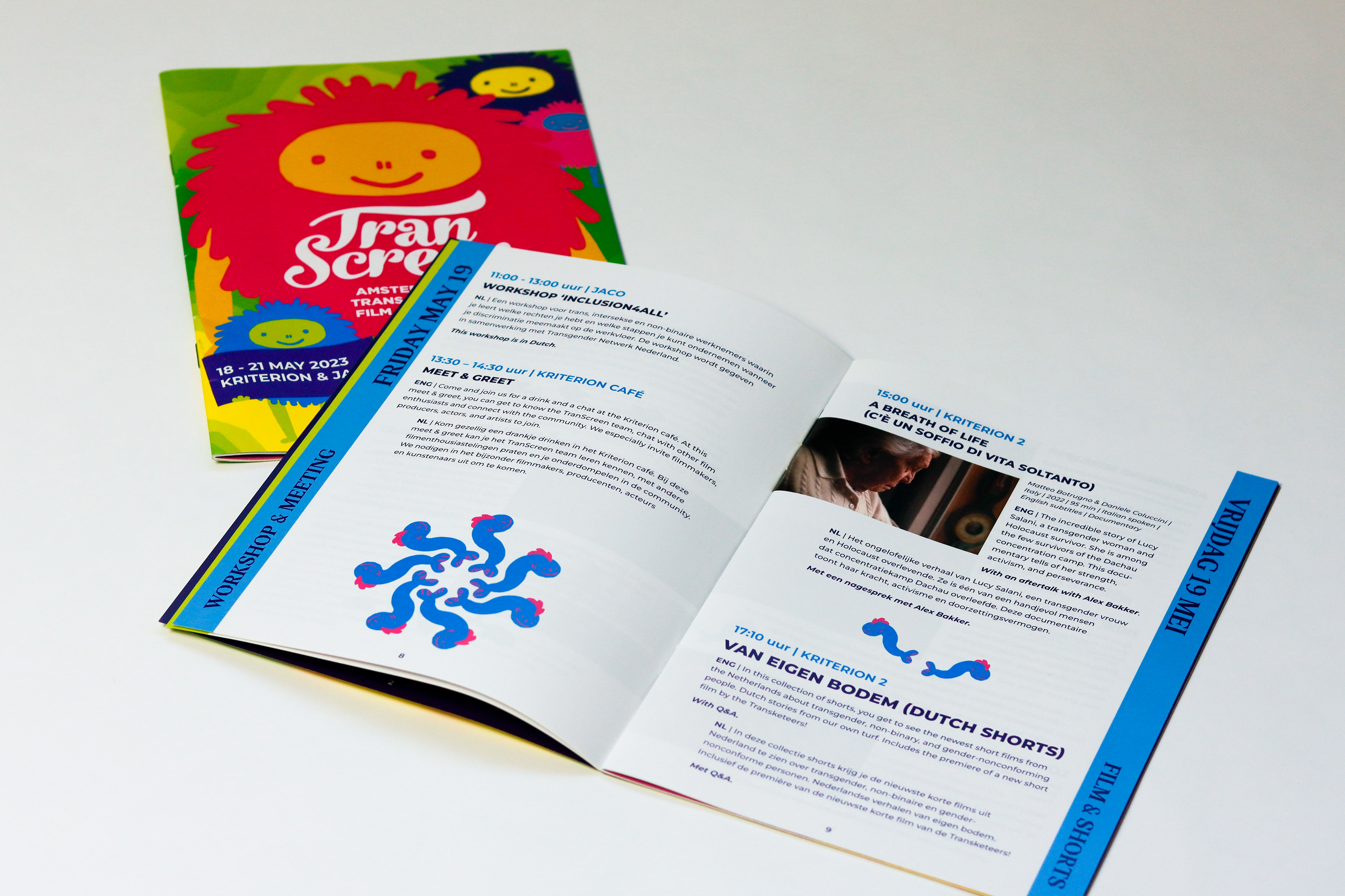 For the 2023 Transcreen Transgender Film Festival, I created a program booklet that, with its colorful and playful design, enhanced the visual presence of the entire campaign in the city.